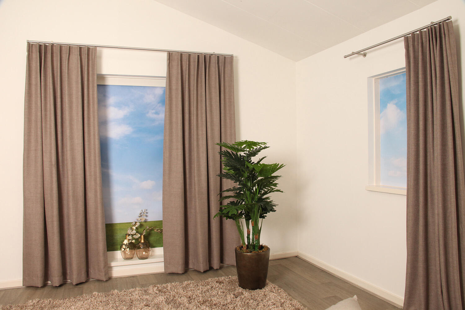 De stof is kamerhoog, wat betekent dat deze gordijnen naadloos kunnen worden geconfectioneerd voor een luxe en elegante uitstraling.