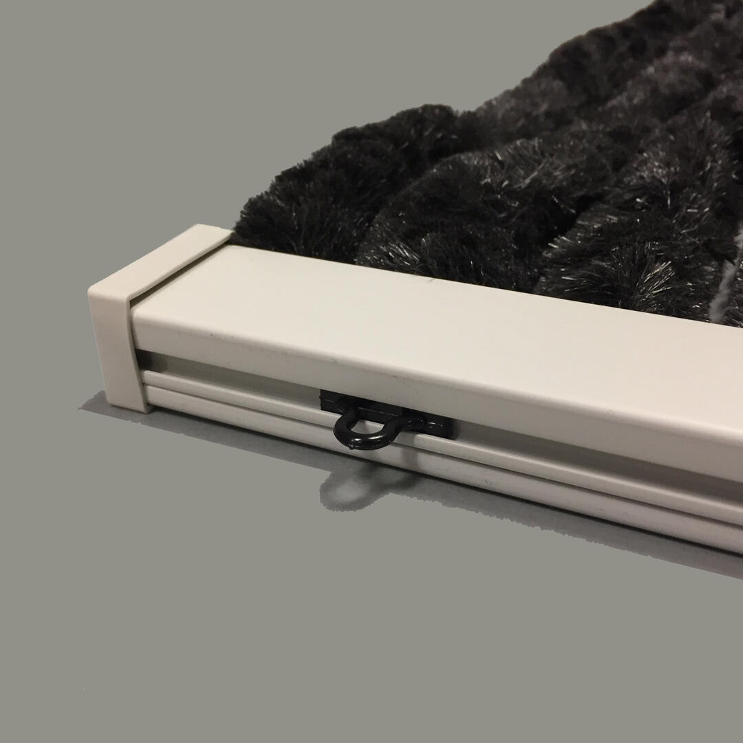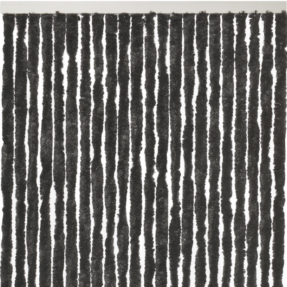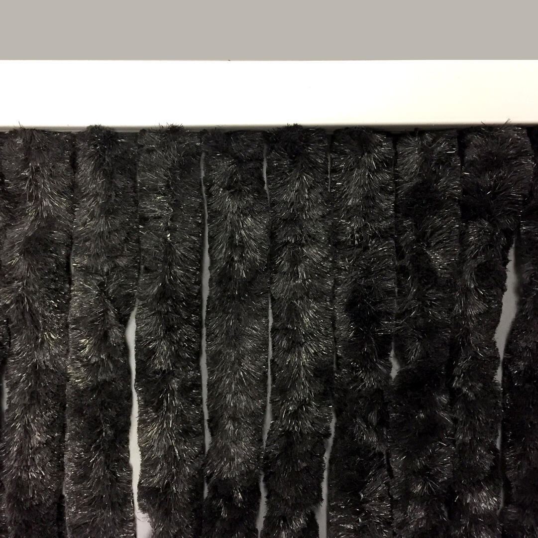Deurgordijn met "kattenstaart" strengen in een zwarte kleur. Bevestiging met twee ophangogen die verschoven kunnen worden. Kan ingekort worden en smaller gemaakt worden door de kunststof bovenzijde op maat te zagen. De kapjes en ophangogen worden in een apart zakje meegeleverd. Ophang haken om in het kozijn te bevestigen zijn niet bijgesloten.