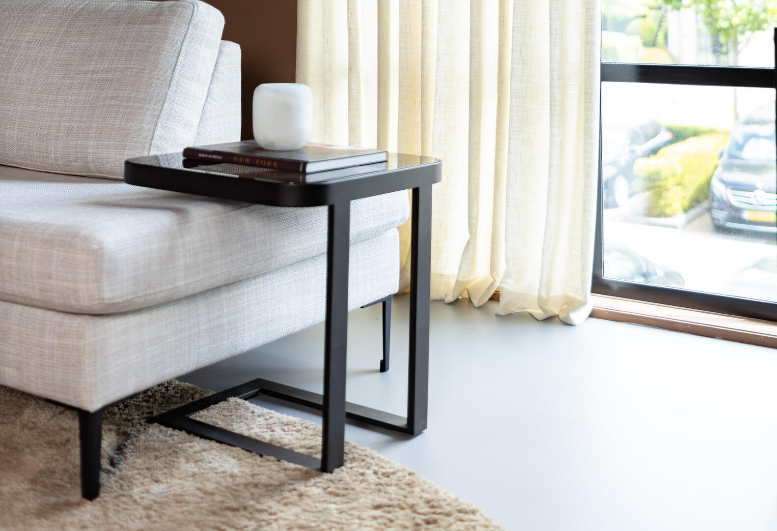 Dit gordijn hangt het mooist stotend dus net op de grond of slepend dus ruim op de grond.