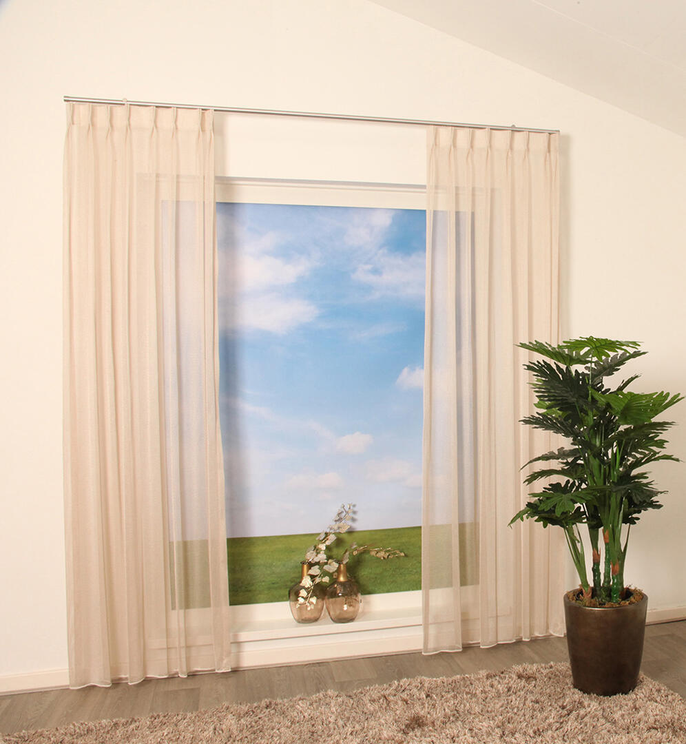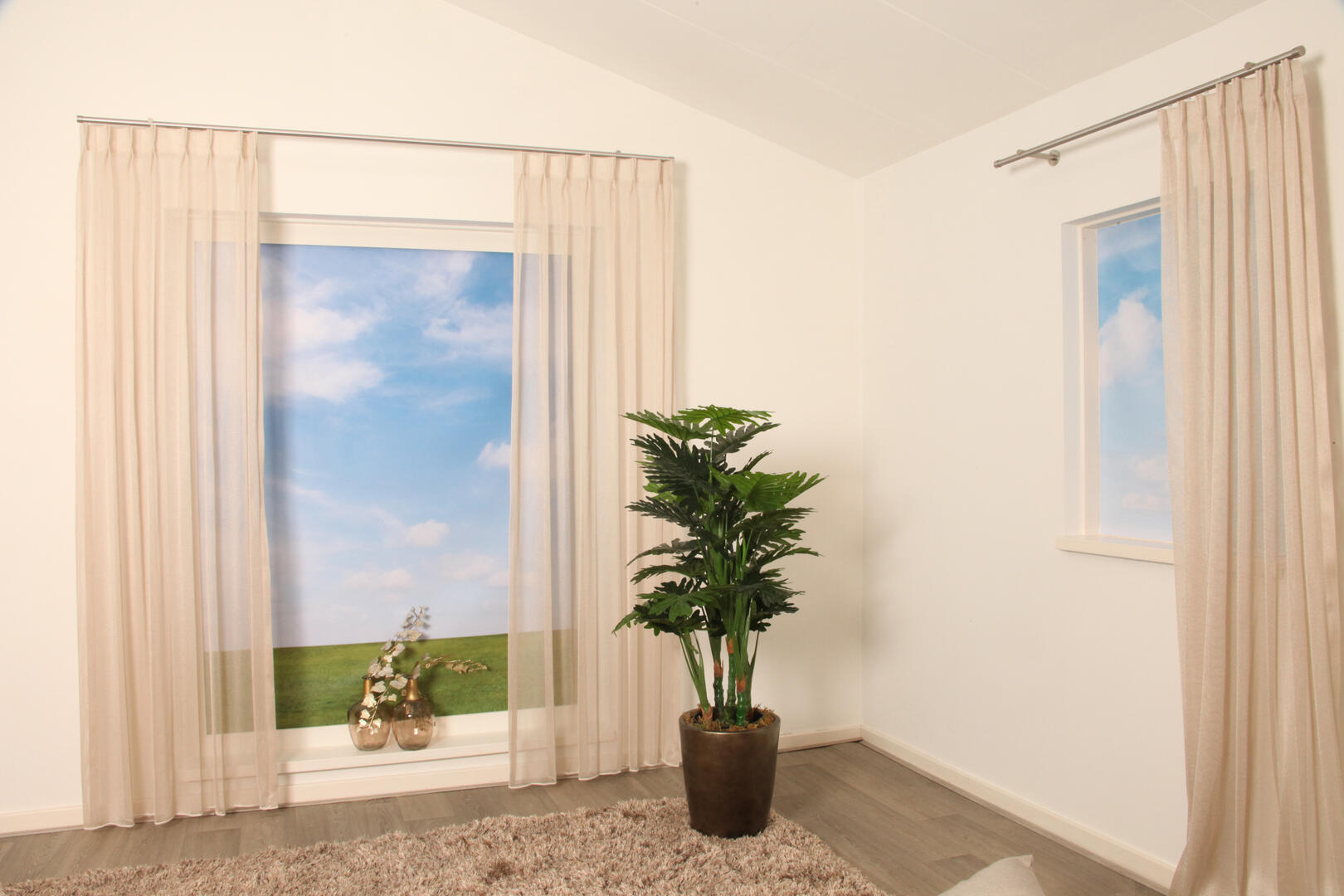 Deze vitrage is kamerhoog, wat betekent dat deze gordijnen naadloos kunnen worden geconfectioneerd voor een luxe en elegante uitstraling.