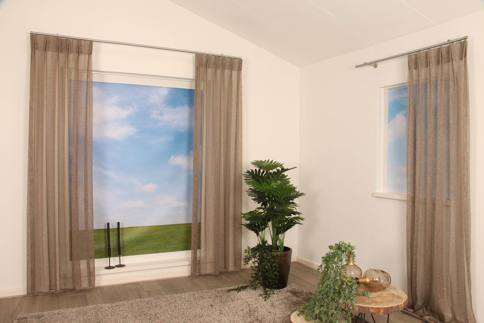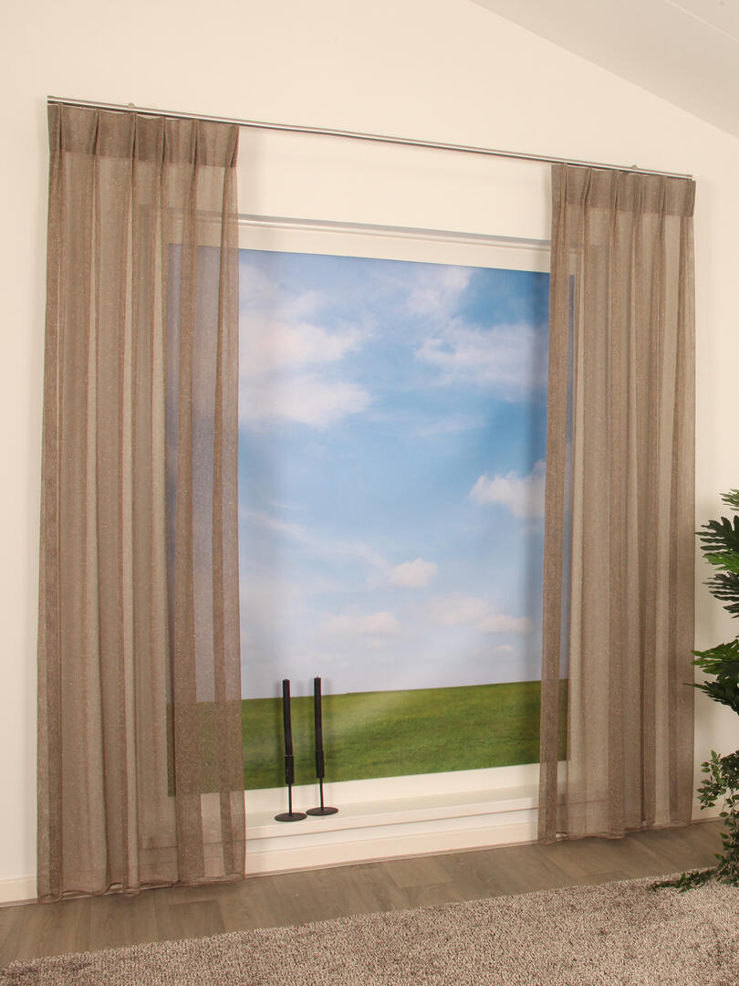 Deze stof is kamerhoog, wat betekent dat deze gordijnen naadloos kunnen worden geconfectioneerd voor een luxe en elegante uitstraling.