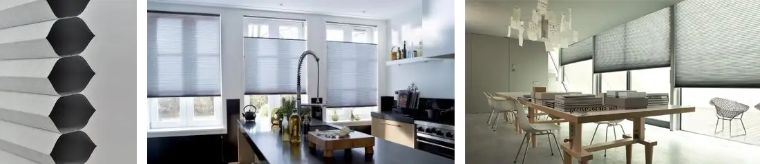 Duo plissés bestaan uit twee laagjes gevouwen stof, die zich als een harmonica opvouwen wanneer deze wordt opgetrokken. Het zijaanzicht geeft het beeld van een honingraatstructuur waar de touwtjes door heen lopen. De koorden zijn niet tot nauwelijks zichtbaar en de gaatjes die bij plissé gordijnen te zien zijn heb je bij duo plissés niet. Dit zorgt voor een strakker model en een nog betere zon en lichtbeheersing. Ook een duo plissé is leverbaar als topdownmodel, zodat je van inkijk geen last hebt maar nog wel naar buiten kunt kijken.