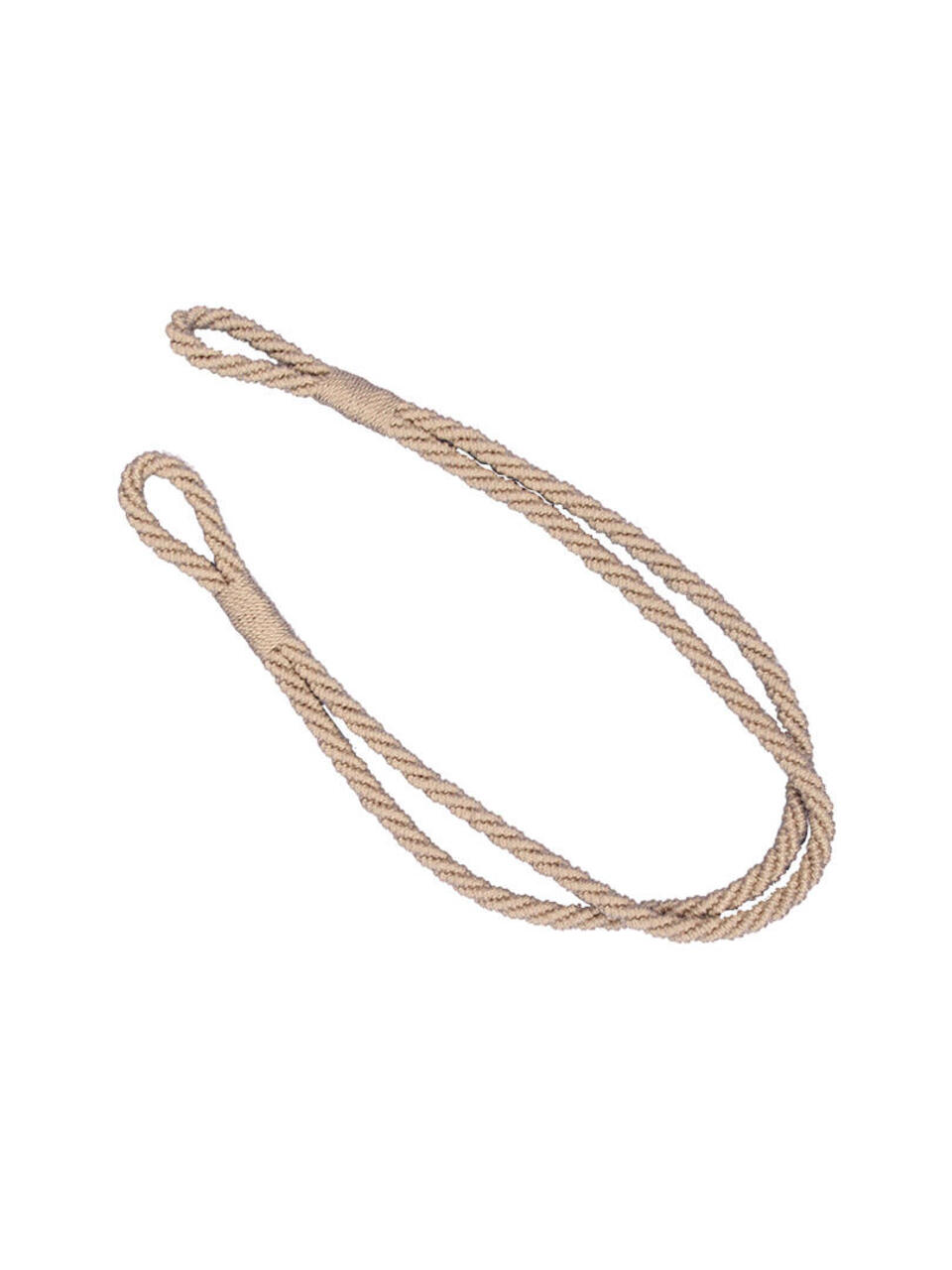 Embrasse in een zandkleur van twee koorden uitgevoerd in een stevig aanvoelende kwaliteit. De lussen worden gevormd door het omwikkelde deel van de embrasse. De lengte tussen de lussen is 50 cm. De totale lenge van de embrasse is 70 cm. Ieder koord heeft een dikte van ongeveer 1 cm.