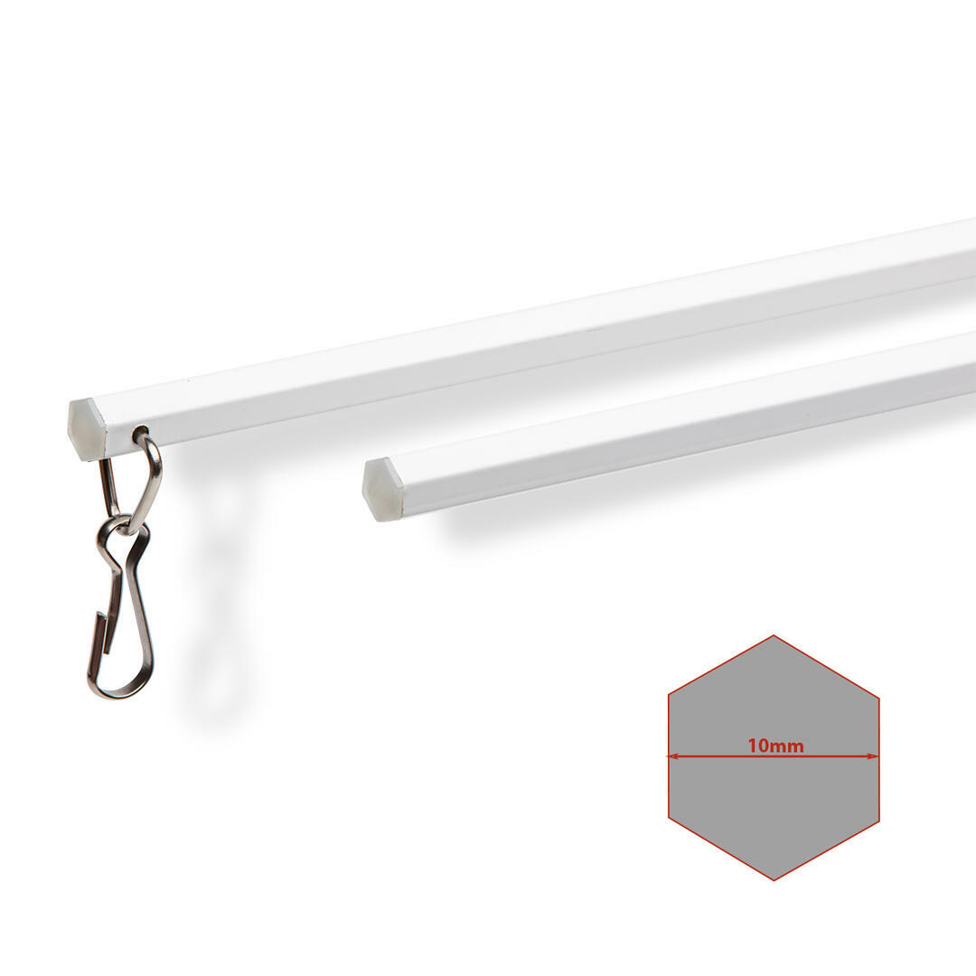 Luxe zeskantige aluminium trekstang in een lengte van 122 cm in de kleur wit. De hoeken zijn mooi afgerond en de boven- en onderzijde van de stang zijn afgewerkt met een kunststof dop. Aan de bovenzijde zit een metalen bevestiging met haak die in een gordijnrunner bevestigd kan worden. Stevige maar lichte trekstang die gebruikt kan worden voor alle type gordijnstoffen.